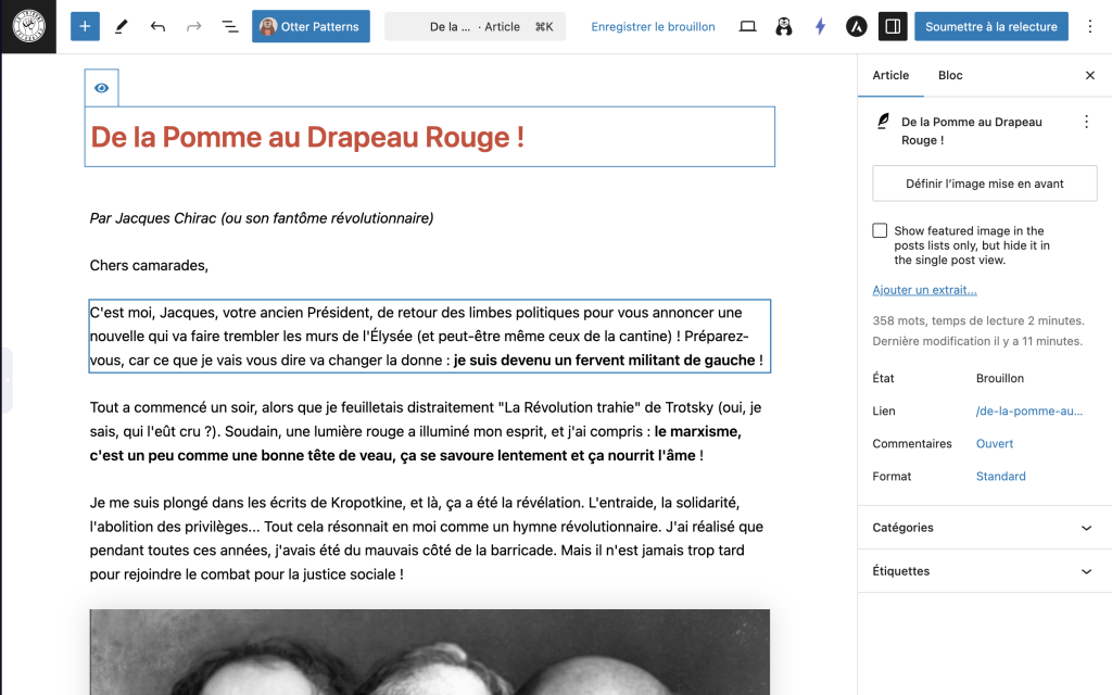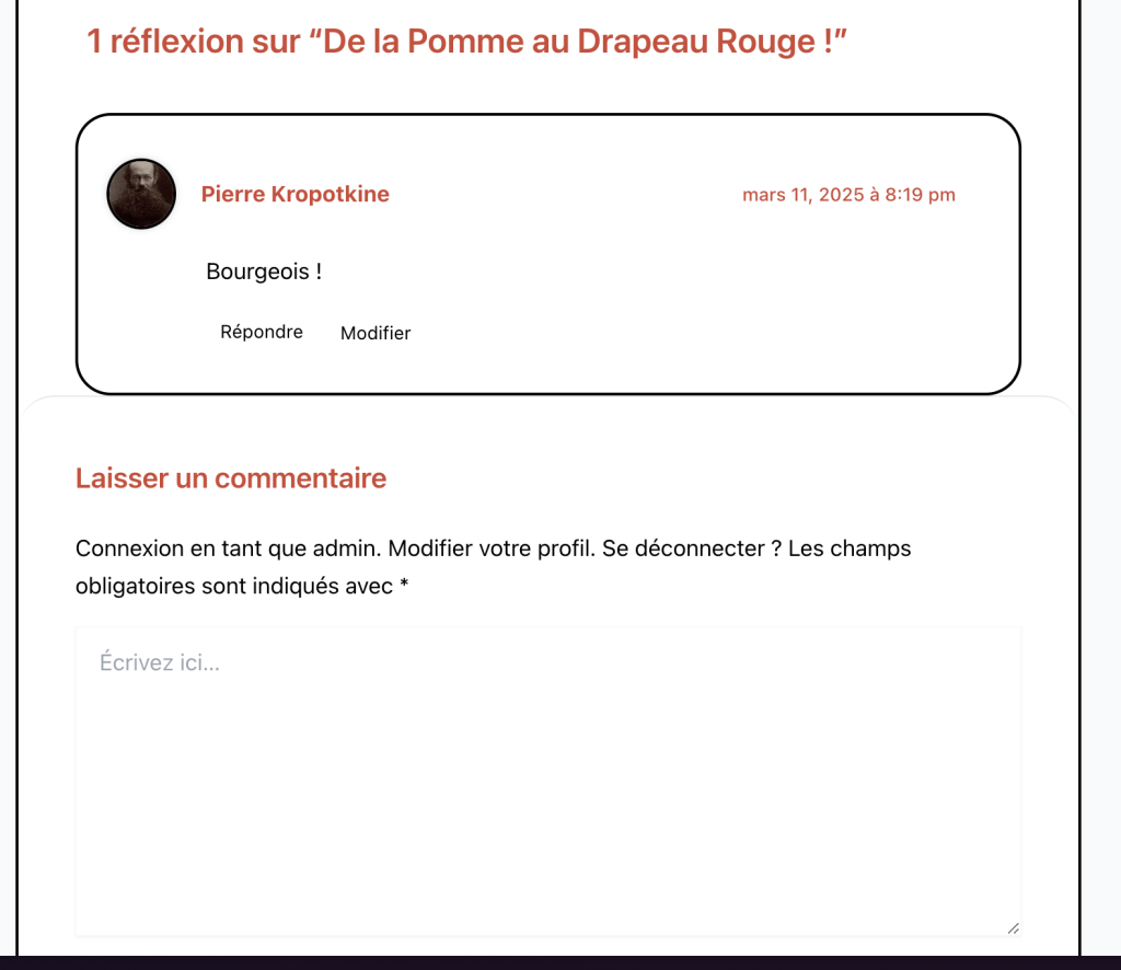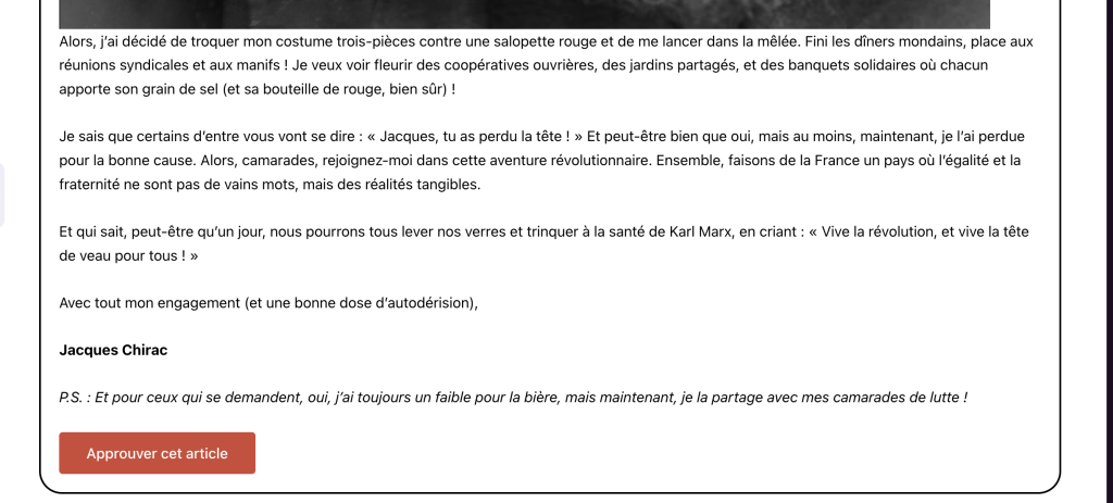 Maintenant, vous vous demandez surement pourquoi votre article à besoin d’être relu. Ce journal n’est pas en autogestion ? Et bien oui, pour éviter que des articles diffamatoires, insultants, ou contraire à nos valeurs de tolérance et de solidarité soit publié sur ce site, un systeme d’editorialisme participatif est en place. Chaque membre avec le statut de Validateur.rice peut approuver les articles proposé. Une fois que 3 personnes ont validé l’article, il est automatiquement publié. Rendez-vous (pour les Validateur.rice) dans la section editorial, partie articles.