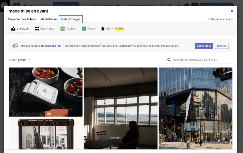 Après avoir cliqué sur Instant Images vous arrivez sur cette page, utilisez la barre de recherche pour trouvé l’image qui correspond parfaitement à votre article !