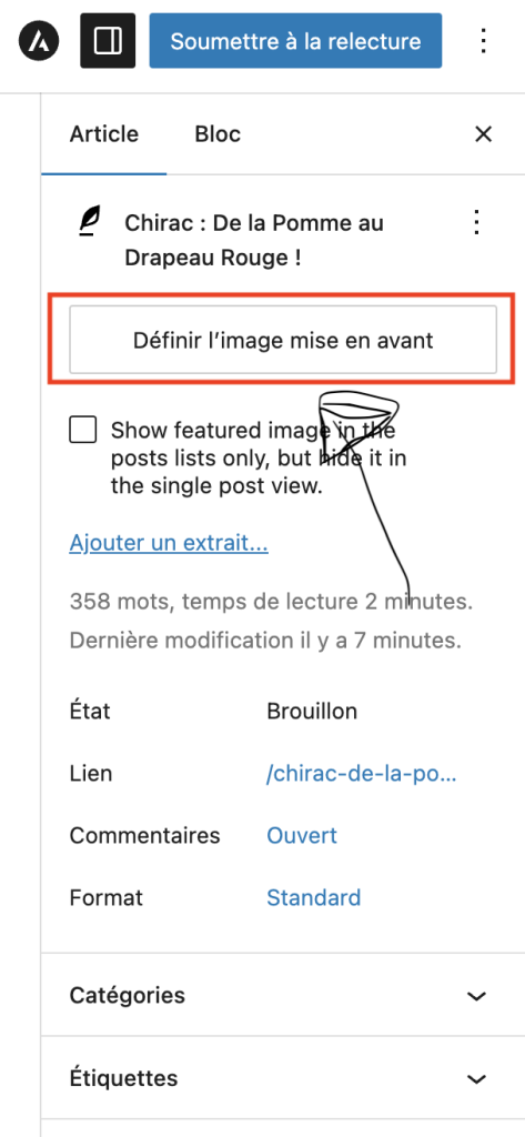 Une fois que vous avez redigé l’ensemble de votre article, il est temps de le soumettre, mais avant cela il y a quelque regles important à respecter pour le bon maintien du site et une meilleur mise en avant de vos écrits. Tout d’abord pensez à choisir une categorie pertinente pour votre article. Ensuite, il faut définir l’image mise en avant.