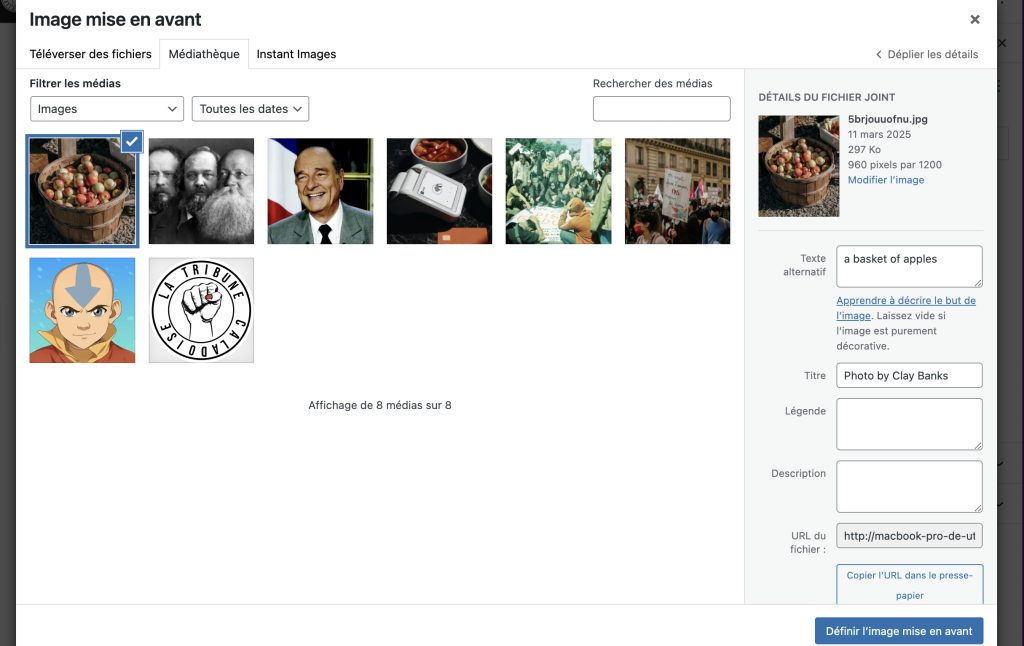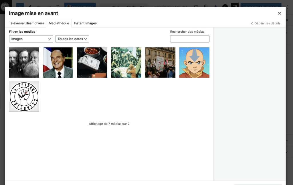Vous arrivez sur cette page sur vous avez accès à plusieurs options. Soit vous pouvez ajouter votre propre image (Téléverser des fichiers), soit utiliser des images que vous avez deja utilisé sur le site (médiathèque). Pour vous aidez nous avons installé un module nommé Instant Images qui vous donnera acces à une immense banque de donnée de photo libre de droit.