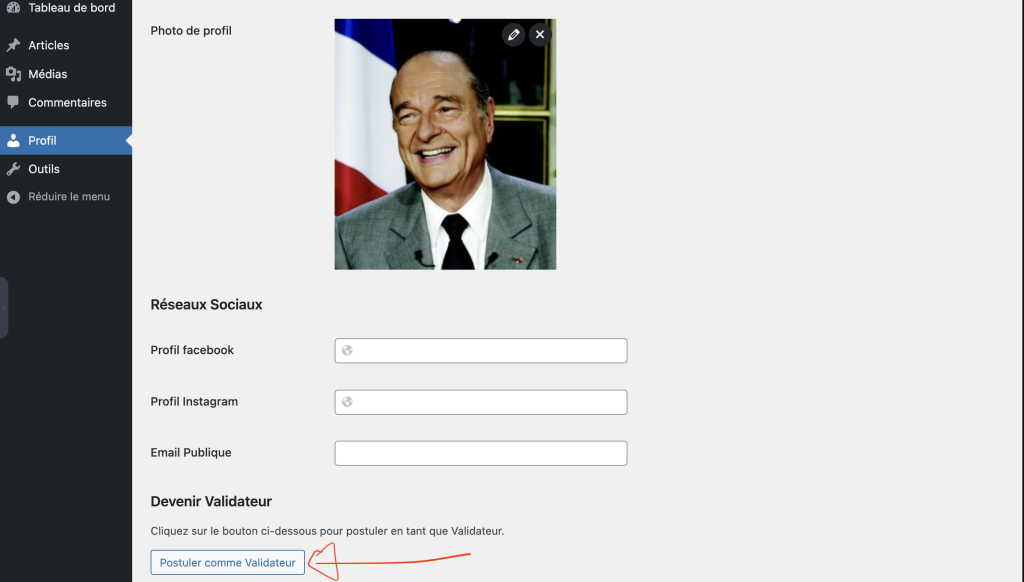 C’est bien tout ça, mais comment on devient Validateur.rice ? Pour ca rendez vous dans votre profil, vous trouverez un bouton qui vous permettra de postuler.